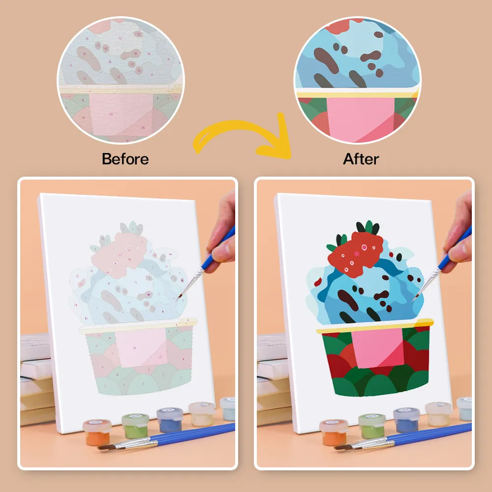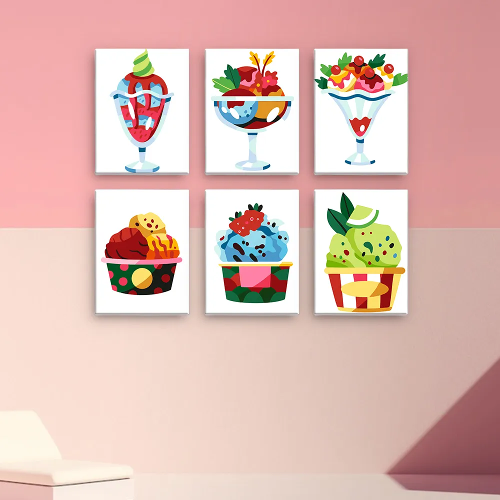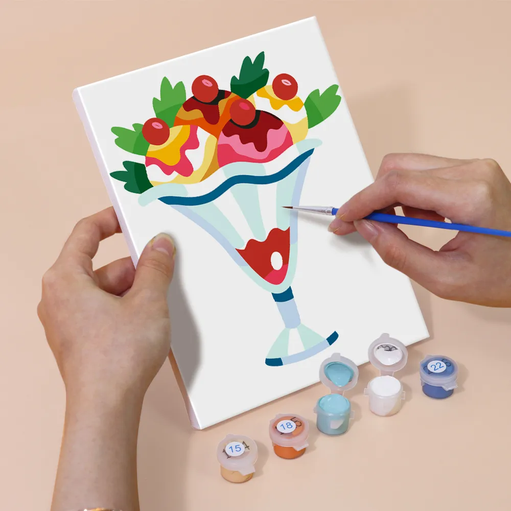 De ‘IJzige Desserts’ Mini Schilderen op Nummer set brengt een zoete verfrissing op het canvas. Of het nu ijs, sorbet of kleurrijke dessertglazen zijn – dit motief combineert genot met creatief gemak en een zomerse sfeer. Perfect voor kinderen, beginners of als klein cadeautje voor zoetekauwen. Het voorbedrukte mini canvas, de levendige acrylverf en de bijpassende kwast zorgen voor ongecompliceerd schilderplezier vol kleur en zoetheid.