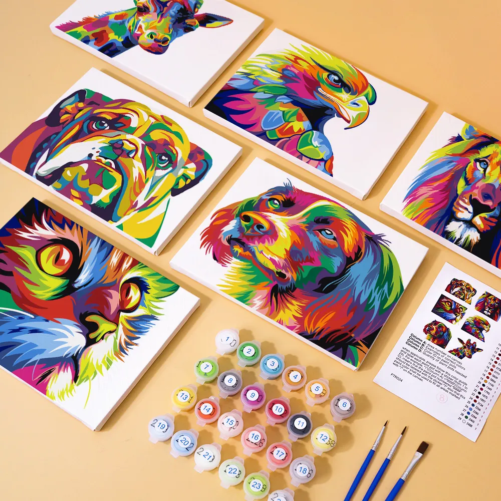 De “Kleurrijke Dieren” Mini Schilderen op Nummer set inspireert met levendige en fantasierijke dierenmotieven. Of het nu een leeuw, uil of olifant is – de heldere kleuren en creatieve details maken deze set tot een vreugdevolle schilderervaring. Dankzij het compacte formaat is het ideaal voor beginners, kinderen of als klein cadeautje. Met het voorbedrukte mini-canvas, genummerde acrylverf en bijpassende kwast creëer je in een handomdraai een uniek kunstwerk.